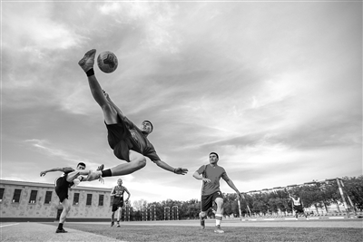 這幅攝影作品展現(xiàn)的是,新疆軍區(qū)某團(tuán)戰(zhàn)士業(yè)余時(shí)間在足球場(chǎng)上競(jìng)技的場(chǎng)景。拍攝者用仰拍的視角,抓拍了上等兵唐小虎傳球的精彩一瞬。畫面具有較強(qiáng)的視覺(jué)沖擊力。藍(lán)天、綠草、年輕的戰(zhàn)士在畫面中結(jié)合,給人以青春蓬勃的力量感,為讀者展現(xiàn)出軍營(yíng)文化生活豐富多彩的一面。
