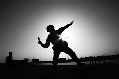 在投彈訓(xùn)練場上,一名戰(zhàn)士全副武裝,小步高頻助跑后,準(zhǔn)備甩彈出手。他瞄準(zhǔn)既定目標(biāo),右手臂大力向后方彎曲蓄力,最后用力一蹬,身體順著這股力量扭轉(zhuǎn),向著目標(biāo)全力甩出手榴彈。