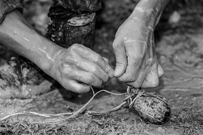 “魔鬼周”極限訓(xùn)練中,特戰(zhàn)隊員們意外遭遇山體滑坡,道路堵塞。他們決定用爆破方式排除障礙,保障戰(zhàn)友們順利前行。一名滿手泥濘的特戰(zhàn)隊員鎮(zhèn)定地蹲在手榴彈邊,有條不紊地連接引線。