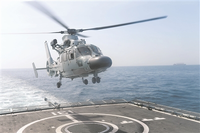 7月28日,我海軍第35批護航編隊順利完成第1321批護航任務(wù),將商船護送至曼德海峽附近海域解護后,被護船舶船長以音頻的方式向我護航官兵表達感謝和八一建軍節(jié)祝福。圖為太原艦艦載直升機升空。江 山攝