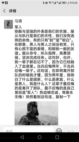 和劉亞奇排長聊天得知,他當(dāng)時和那位武警戰(zhàn)士合影就是被那身帥氣的軍裝打動,也就是從那時起,劉亞奇在心底埋下了軍旅夢的種子。所以在12年后夢圓之際,他回首往事,情難自已,在微信朋友圈袒露心跡。
