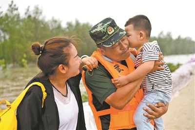 進入汛期以來,江西部分河流湖泊水位持續(xù)上漲,超警戒水位,武警江西總隊九江支隊副參謀長焦守偉帶領(lǐng)官兵第一時間趕往災(zāi)情嚴(yán)重的江洲鎮(zhèn)抗洪搶險,已經(jīng)近一個月沒有回家。周末,妻子帶著兒子來到堤壩看望正在執(zhí)行任務(wù)的焦守偉。來不及回宿營地的一家三口,在堤壩上享受短暫的團聚時光。
