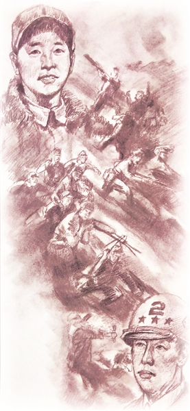 身后是鴨綠江,前面是“三八線”,一群中華民族的優(yōu)秀兒女在這里毅然承擔(dān)起保衛(wèi)和平的歷史使命。當(dāng)戰(zhàn)士們?cè)谀抢锟磻T了流血時(shí),他們只有一個(gè)念頭:戰(zhàn)斗!英勇的意志給了他們無(wú)限力量,全身沖激著滾沸的血?!按缤敛蛔尅薄皥?jiān)決固守”的口號(hào)聲、宣誓聲,擰成一股巨大的吼聲,在五圣山前沿的高地縱橫決蕩。