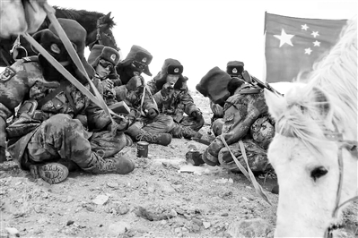 朱允來所在連隊是位于海拔4600米的扎西崗邊防連,2013年被中央軍委授予“雪域高原戍邊模范連”稱號。此番軍校之行,他特意帶了一張雪域巡邏的照片:莽莽雪原,他和戰(zhàn)士們席地而坐吃著干糧,身旁是高大的軍馬和飄揚的五星紅旗。