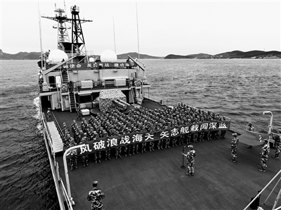 在這片一望無(wú)垠的深藍(lán)中,他們有“縱睨黃渤南北,弋巡金烏余暉”的氣宇軒昂,有“昔嘆鄧公折長(zhǎng)劍,今以利舸鑄英碑”的凌云壯志,有“九州繪應(yīng)輿斗,六分儀定海扉”的運(yùn)籌帷幄……今有鶻鷹三百眾,拘濤披雨戰(zhàn)驚雷,足壯海軍威!