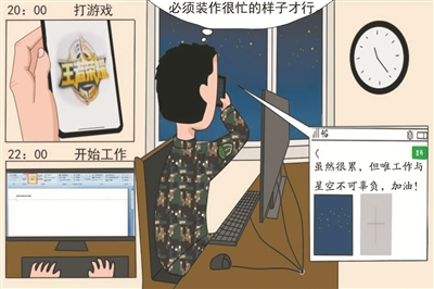 其實(shí),這種朋友圈里的“努力”在我們身邊并不鮮見。有的機(jī)關(guān)干部晚上在辦公室里玩手機(jī),等領(lǐng)導(dǎo)一走,自己也立刻下班,卻不忘在朋友圈感慨“加班很充實(shí)”;有的戰(zhàn)士購買了很多熱門圖書,又是拍封面、又是做計(jì)劃,發(fā)一條朋友圈后便將這些書束之高閣;還有的把朋友圈設(shè)置成僅對單位領(lǐng)導(dǎo)可見,投其所好發(fā)文貼圖,只為給領(lǐng)導(dǎo)留下好印象。