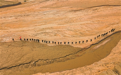 荒涼蒼茫的黃土地上,紅旗隨風漫卷,隊伍蜿蜒向前,野外拉練的官兵已經(jīng)走了很遠。他們背著沉重的背囊,腳步始終堅定,目標始終如一。