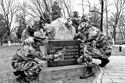 左上圖:戰(zhàn)士們擦拭“英雄營”紀念碑。劉 川攝