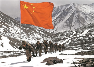 萬籟俱寂的雪域高原,稀薄的空氣、厚厚的積雪、傾斜的坡度,使行軍變得更加艱難。但邊防官兵不怕路途艱難,克服高原反應(yīng),讓五星紅旗高高飄揚在祖國的邊境巡邏線上。