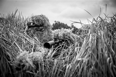 4月20日,武警第二機動總隊某支隊在密林深處開展小組綜合戰(zhàn)術(shù)演練。圖為特戰(zhàn)隊員正在偽裝潛伏。 楊曉晨攝