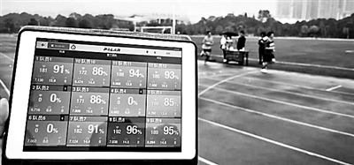 圖②:利用數(shù)字化監(jiān)測(cè)系統(tǒng)實(shí)時(shí)跟蹤記錄小組長(zhǎng)跑測(cè)試數(shù)據(jù)。張?jiān)品珨z