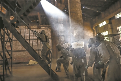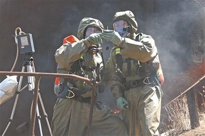 “3名‘暴恐分子’藏匿于化工廠二樓!”晨曦微露,偵察隊員段鳳喬一邊報告?zhèn)刹烨闆r,一邊掩護防化分隊?wèi)?zhàn)友對廠區(qū)泄漏化學(xué)物質(zhì)進行處理。