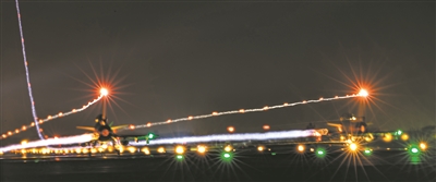 圖①:戰(zhàn)機(jī)在漆黑如墨的空中劃出一道道亮麗航線。