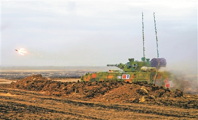 實(shí)兵行動(dòng)開始后,只見空中一架架戰(zhàn)機(jī)發(fā)射密集火力,對(duì)“恐怖武裝”實(shí)施猛烈打擊。緊接著,炮兵分隊(duì)對(duì)“敵”縱深陣地實(shí)施火力覆蓋。重火突擊之后,隱蔽在草原深處的我軍輪式裝甲分隊(duì),從半地下掩體一躍而出,向“敵”陣地突進(jìn)。