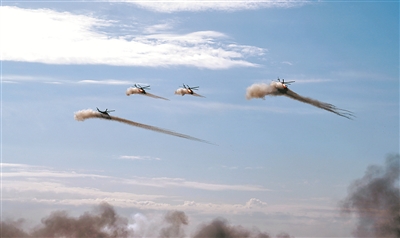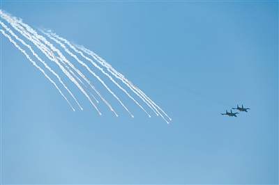 空中戰(zhàn)機(jī)呼嘯,地面鐵甲奔流。伴著濃濃硝煙,多型戰(zhàn)機(jī)、火炮、坦克等裝備向“敵”陣地發(fā)起迅猛沖擊……