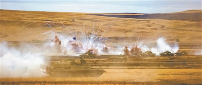 莽莽草原上,一輛輛步戰(zhàn)車、突擊車等輪式裝甲裝備組成的地面突擊隊(duì)雷霆出擊,相繼展開戰(zhàn)斗隊(duì)形向“敵”縱深發(fā)起猛烈攻勢(shì)。多國(guó)聯(lián)合部隊(duì)展現(xiàn)出強(qiáng)大的火力突擊力,使用空中和地面火力,對(duì)“恐怖武裝”實(shí)施多波次打擊。伴隨著一陣陣爆炸聲,“敵”陣地火光沖天,濃塵蔽日,一個(gè)個(gè)目標(biāo)灰飛煙滅……