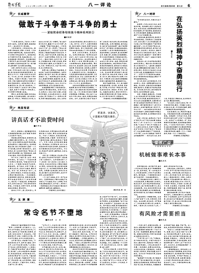 真話之于軍人,意義更加重大。軍隊(duì)是要打仗的,不管是建議還是決策,都事關(guān)戰(zhàn)斗力建設(shè),事關(guān)未來戰(zhàn)場(chǎng)的勝負(fù)。只有人人講真話,及時(shí)發(fā)現(xiàn)問題,及時(shí)解決問題,才能第一時(shí)間彌補(bǔ)戰(zhàn)斗力建設(shè)的短板,避免未來戰(zhàn)場(chǎng)上“栽跟頭”。對(duì)軍人來說,時(shí)間就意味著勝利。敢講真話,不浪費(fèi)時(shí)間,就可以在有效的時(shí)間內(nèi)做更多的事,未來戰(zhàn)場(chǎng)上就可能擁有更多的底氣和資本??梢哉f,講真話節(jié)省時(shí)間,贏得戰(zhàn)機(jī),本身也是戰(zhàn)斗力。