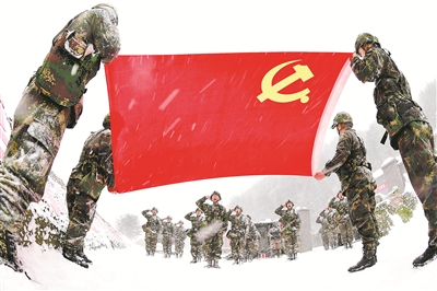 上圖:在嚴(yán)寒條件下進(jìn)行實兵對抗演練的火箭軍某部開展戰(zhàn)地動員,組織向黨旗宣誓活動。