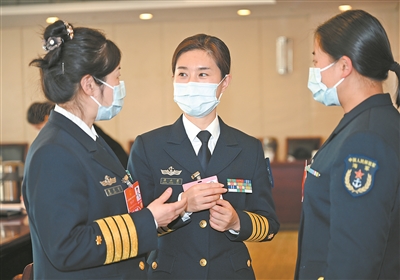 3月8日下午,解放軍和武警部隊(duì)代表團(tuán)舉行小組會(huì)議,審議全國(guó)人大常委會(huì)工作報(bào)告。圖為軍隊(duì)人大代表曹京宜、蔣永馨、楊揚(yáng)(從左至右)在會(huì)議間隙討論交流。本報(bào)記者 穆瑞林?jǐn)z