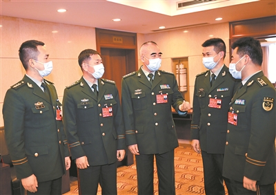 3月9日,解放軍和武警部隊代表團(tuán)進(jìn)行分組審議。圖為來自武警部隊的代表趙賀、王剛、宋波、鄭浩、褚旭亮(從左至右)在會議間隙交流。本報記者 穆瑞林?jǐn)z