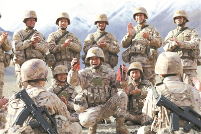 新疆軍區(qū)某團(tuán)組織理論文藝骨干在訓(xùn)練一線宣傳黨的二十大精神。