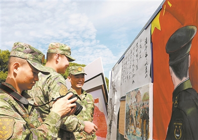 水墨畫“錦繡山河”大氣磅礴,簡筆畫“青春鐵拳”創(chuàng)意新穎,軟筆書法“奮斗不息”遒勁有力……黨的二十大召開期間,陸軍第72集團軍某旅組織展出百余件官兵自創(chuàng)的歡慶盛會主題書畫作品,引來官兵駐足觀賞。