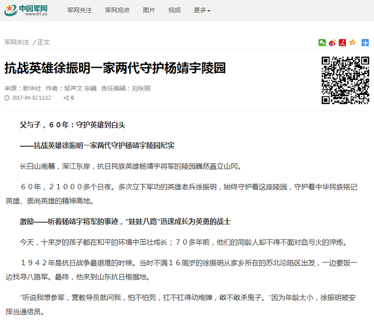 這是中國軍網(wǎng)等網(wǎng)絡(luò)新媒體平臺4月2日編發(fā)的一條稿件《抗戰(zhàn)英雄徐振明一家兩代守護楊靖宇陵園》。