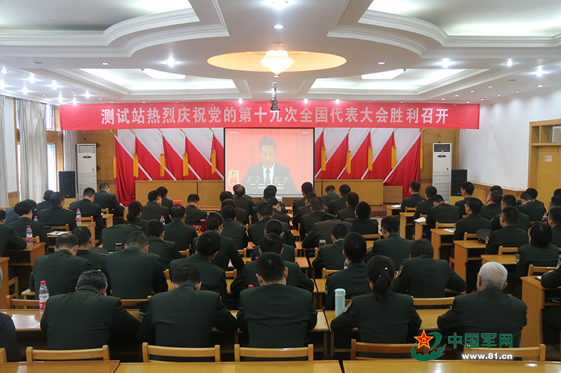 該基地某場區(qū)測試站官兵觀看黨的十九大開幕會。