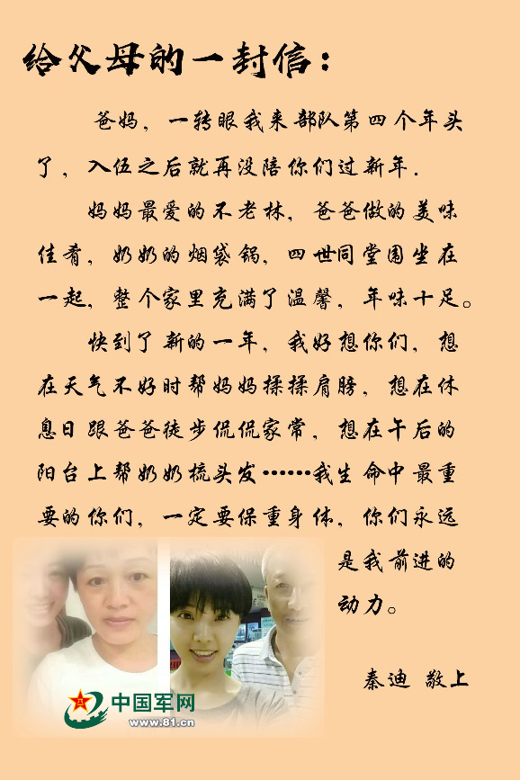 爸媽,一轉(zhuǎn)眼我來部隊第四個年頭了,入伍之后就再沒陪你們過新年,媽媽最愛的不老林,爸爸做的美味佳肴,奶奶的煙袋鍋,四世同堂圍坐在一起,整個家里充滿了溫馨,年味十足。快到了新的一年,我好想你們,想在天氣不好時幫媽媽揉揉肩膀,想在休息日跟爸爸徒步侃侃家常,想在午后的陽臺上幫奶奶梳頭發(fā)……我生命中最重要的你們,一定要保重身體,你們永遠是我前進的動力。