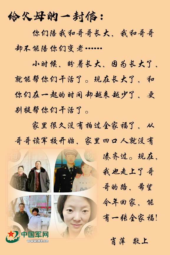 你們陪我和哥哥長(zhǎng)大,我和哥哥卻不能陪你們變老……小時(shí)候,盼著長(zhǎng)大,因?yàn)殚L(zhǎng)大了,就能幫你們干活了?,F(xiàn)在長(zhǎng)大了,和你們?cè)谝黄鸬臅r(shí)間卻越來(lái)越少了,更別提幫你們干活了。家里很久沒(méi)有拍過(guò)全家福了,從哥哥讀軍校開(kāi)始,家里四口人就沒(méi)有湊齊過(guò)?,F(xiàn)在,我也走上了哥哥的路,希望今年回家,能有一張全家福!