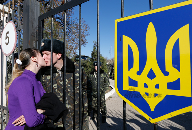 2014年3月3日,烏克蘭貝爾貝克軍事基地內(nèi),被困的烏克蘭士兵與妻子隔圍欄親吻。該基地目前約有100到200名烏克蘭士兵被困,這些士兵未向俄軍投降仍然效忠烏克蘭政府。由于基地被俄軍包圍,因此基地內(nèi)的士兵只能與親人采取這樣的方式交流。