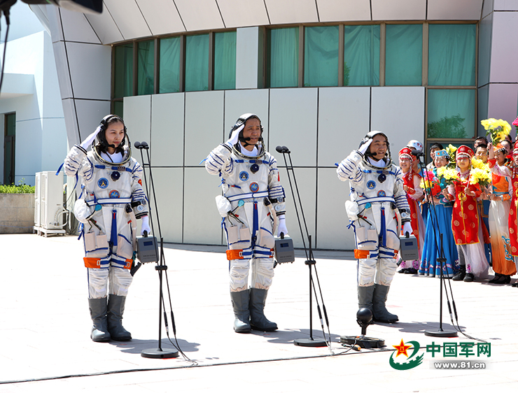 神舟十號(hào)乘組航天員聶海勝、張曉光、王亞平在酒泉衛(wèi)星發(fā)射中心參加航天員出征儀式。徐部攝