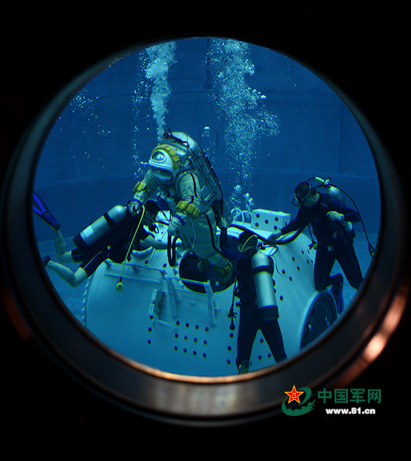 航天員在模擬失重水槽進(jìn)行水下出艙訓(xùn)練。朱九通攝