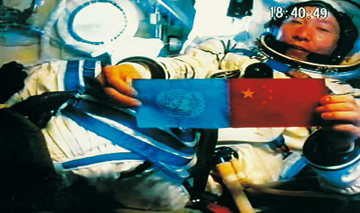 航天員楊利偉在神舟五號飛船內(nèi)展示中國國旗和聯(lián)合國國旗。