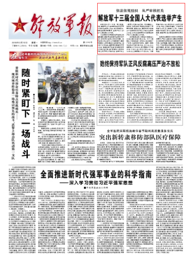 日前,解放軍23個選舉單位先后召開軍人代表大會或軍人大會,充分發(fā)揚民主,按照法定程序和要求,選舉產(chǎn)生了269名十三屆全國人大代表。請關(guān)注今日出版的《解放軍報》的詳細報道——