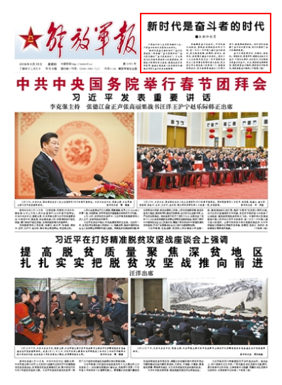 習(xí)主席在2018年春節(jié)團(tuán)拜會(huì)上的重要講話(huà),回顧奮斗取得的偉大成就,展望未來(lái)的美好前景,激勵(lì)全國(guó)各族人民在新時(shí)代繼續(xù)書(shū)寫(xiě)偉大奮斗的歷史新篇章!今天出版的《解放軍報(bào)》在報(bào)眼位置發(fā)表評(píng)論員文章《新時(shí)代是奮斗者的時(shí)代》,文章說(shuō):“奮斗是走進(jìn)新時(shí)代的通行證。春節(jié)是新的開(kāi)始,預(yù)示著新的希望。讓我們用奮斗奪取新的勝利,靠奮斗贏得新的榮光?!?/font>