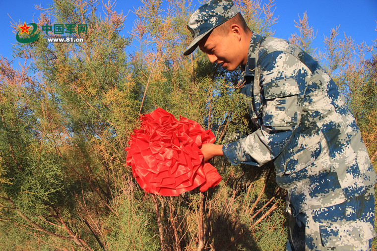 金秋,碧空如洗,遍布黑色風棱石的鹽堿地上,一簇簇紅柳綻放出鮮艷的紅色。相較于春天的黃、夏天的綠、冬天的白,在這蒼?;募诺谋苯瓯谏?,還有什么比紅色更適合退伍季? 50多年前,三塘湖雷達站從昆侖山巔移防到這片荒漠。長年不見綠色的官兵發(fā)現(xiàn)這里只生長紅柳,第一任指導員王佳新說:“那就多種紅柳吧,我們也要像紅柳一樣扎根邊防!” 從此,雷達站形成了“新兵入伍、老兵退伍時種一棵紅柳樹”的傳統(tǒng)。