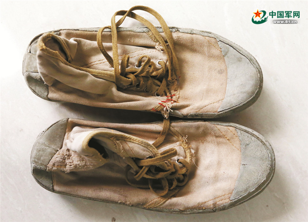 王繼才生前穿過的黃膠鞋。因島上空氣濕度大、鹽分高,膠鞋已嚴(yán)重褪色變形。