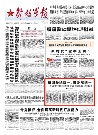 實(shí)現(xiàn)祖國(guó)完全統(tǒng)一,是全體中華兒女共同心愿,是中華民族根本利益所在,也是人民軍隊(duì)的神圣使命。統(tǒng)一是歷史大勢(shì),是正道。“臺(tái)獨(dú)”是歷史逆流,是絕路。請(qǐng)關(guān)注今日《解放軍報(bào)》的報(bào)道——
