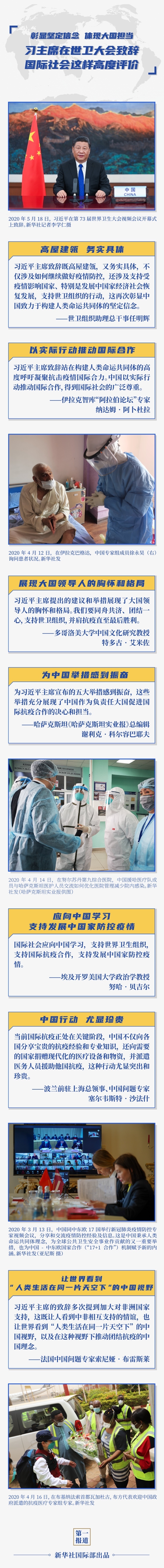 新華社北京5月19日電 5月18日晚,習(xí)近平主席在第73屆世界衛(wèi)生大會視頻會議開幕式上發(fā)表題為《團(tuán)結(jié)合作戰(zhàn)勝疫情共同構(gòu)建人類衛(wèi)生健康共同體》的致辭。習(xí)主席在致辭中提出加強(qiáng)疫情防控六項(xiàng)建議以及中國為推進(jìn)全球抗疫合作五大舉措,彰顯了中國致力于構(gòu)建人類命運(yùn)共同體的堅(jiān)定信念,體現(xiàn)了中國積極推動全球抗疫合作的大國擔(dān)當(dāng),得到國際社會積極呼應(yīng)和高度評價(jià)。