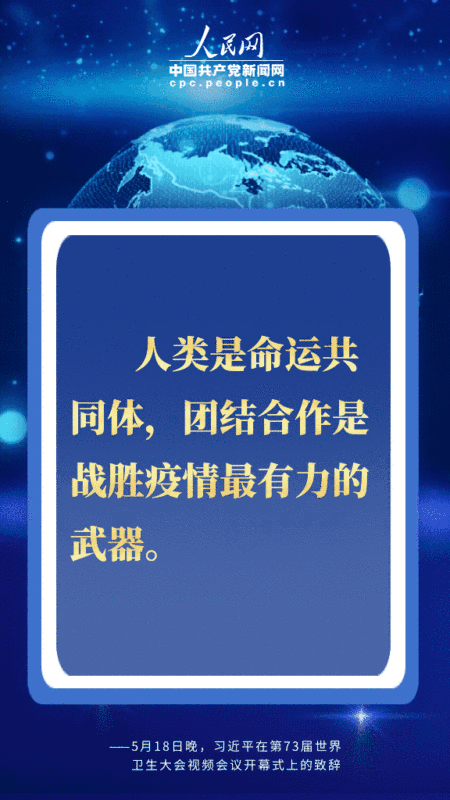 編者按:北京時(shí)間5月18日晚,國(guó)家主席習(xí)近平在第73屆世界衛(wèi)生大會(huì)視頻會(huì)議開(kāi)幕式上發(fā)表題為《團(tuán)結(jié)合作戰(zhàn)勝疫情 共同構(gòu)建人類衛(wèi)生健康共同體》的致辭。習(xí)近平從共同構(gòu)建人類衛(wèi)生健康共同體的高度,深刻闡述中國(guó)抗疫主張,提出一系列重要倡議,對(duì)于提振全球抗疫信心,推進(jìn)國(guó)際抗疫合作,擘畫未來(lái)全球治理體系,具有十分重要的現(xiàn)實(shí)和深遠(yuǎn)意義。人民網(wǎng)·中國(guó)共產(chǎn)黨新聞網(wǎng)用四個(gè)關(guān)鍵詞為您梳理。
