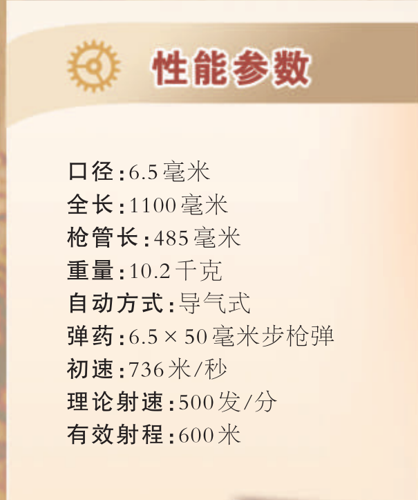 “歪把子”采用導(dǎo)氣式自動(dòng)原理,槍管外側(cè)設(shè)有螺紋狀散熱片以輔助降溫。該槍可使用與三八式步槍通用的6.5×50毫米步槍彈及5發(fā)標(biāo)準(zhǔn)彈夾,但受口徑限制,槍彈威力較為有限。