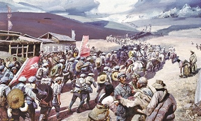 油畫《北上》創(chuàng)作于1996年,現(xiàn)藏于中國(guó)人民革命軍事博物館,描繪的是紅2、紅4方面軍在四川甘孜地區(qū)勝利會(huì)師后,告別甘孜群眾繼續(xù)北上,為實(shí)現(xiàn)大會(huì)師向陜甘根據(jù)地進(jìn)發(fā)的場(chǎng)景。