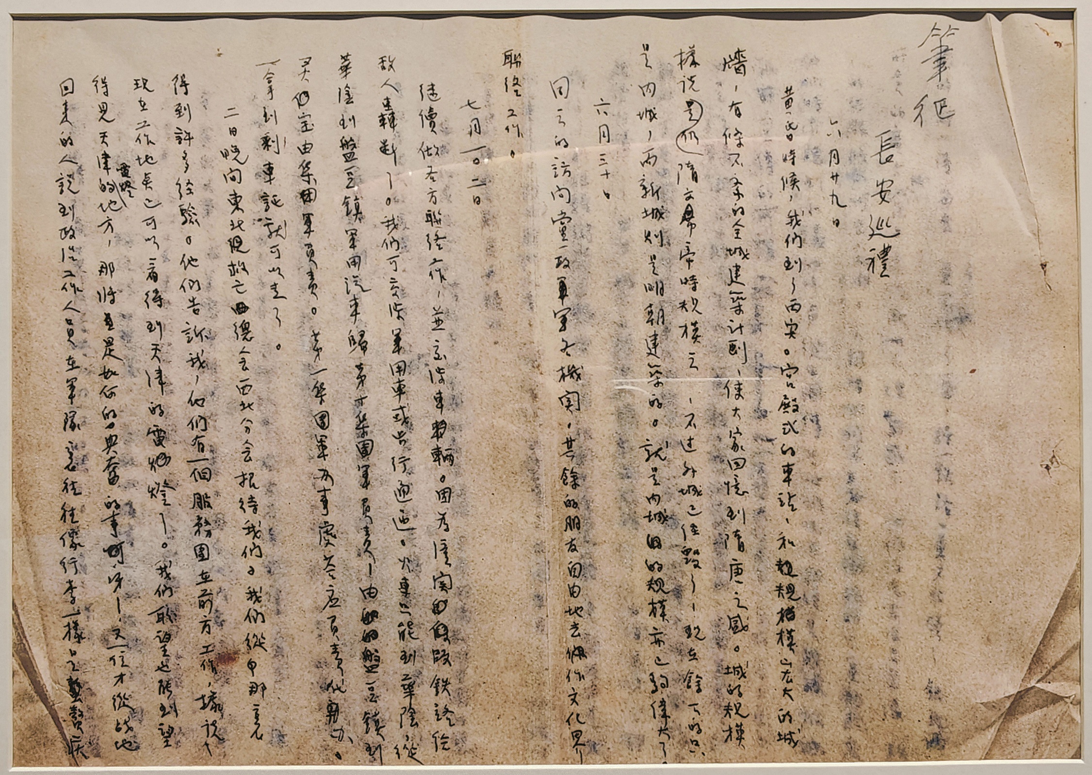 1938年3月27日,中華全國文藝界抗敵協(xié)會在漢口總商會禮堂正式成立,提出“文章下鄉(xiāng),文章入伍”的口號,鼓勵文藝工作者深入農(nóng)村、深入戰(zhàn)地前線去“戰(zhàn)斗”。愛國詩人王禮錫率領(lǐng)的作家戰(zhàn)地訪問團(tuán)成為響應(yīng)口號的文化團(tuán)體之一。該團(tuán)于1939年6月18日出發(fā),深入晉、冀、豫、陜等地,在民眾中走訪,用詩歌、小說、戲劇、散文、圖畫等形式將敵后軍民可歌可泣的英雄事跡呈現(xiàn)出來。王禮錫不僅參與訪問團(tuán)寫集體日記的任務(wù),還堅持寫個人日記?,F(xiàn)存的27篇日記,具體生動地記錄了他戰(zhàn)地征途的所見所聞,留下了珍貴的抗戰(zhàn)史料。2024年,《筆征日記》被評為國家一級文物。(王艾濤攝于中國現(xiàn)代文學(xué)館)