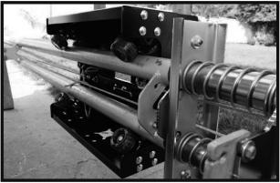 Action Target公司的軌道式牽引靶標(biāo)Track Runner,采用了如圖2所示的獨(dú)特的軌道牽引方式,其導(dǎo)軌為圓柱形鋼管,9個(gè)導(dǎo)輪卡住導(dǎo)軌沿導(dǎo)軌滾動(dòng),Action Target稱其為wrap-around design,這樣可使導(dǎo)輪的滾動(dòng)非常平滑且噪聲極小,另外可以在近可能的減輕移動(dòng)平臺(tái)重量的同時(shí)增強(qiáng)其抗風(fēng)能力。