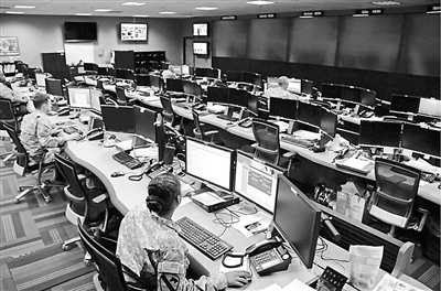 美國陸軍網(wǎng)絡中心內(nèi),值班的軍官和士兵進行網(wǎng)絡情況監(jiān)控。本報資料圖片