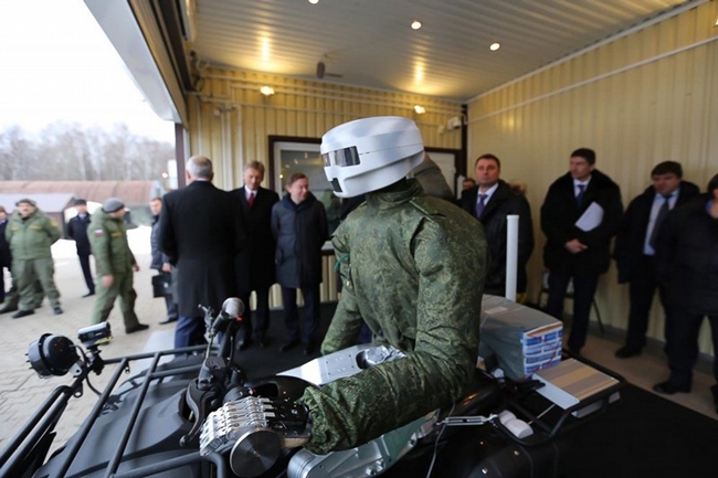 俄羅斯科研部門最新研發(fā)出一種作戰(zhàn)機(jī)器人,作戰(zhàn)技能幾乎不遜于人類。作戰(zhàn)機(jī)器人外形與真人相似,頭戴銀白色頭盔,身穿軍綠色上衣,腿部和雙手的機(jī)械構(gòu)造清晰可見。它的四肢裝有傳感器,可遠(yuǎn)程操控。