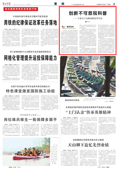 今年兩會(huì),習(xí)主席在出席解放軍代表團(tuán)全體會(huì)議時(shí)強(qiáng)調(diào),在全軍大力傳播科學(xué)精神、普及科學(xué)知識(shí),使學(xué)習(xí)科技、運(yùn)用科技在全軍蔚然成風(fēng)。去年,習(xí)主席在全國(guó)科技創(chuàng)新大會(huì)、兩院院士大會(huì)、中國(guó)科協(xié)第九次全國(guó)代表大會(huì)上指出,科技創(chuàng)新、科學(xué)普及是實(shí)現(xiàn)創(chuàng)新發(fā)展的兩翼,要把科學(xué)普及放在與科技創(chuàng)新同等重要的位置。這些都充分說明,推動(dòng)科技興軍,要高度重視科學(xué)普及在創(chuàng)新發(fā)展中的重要作用。