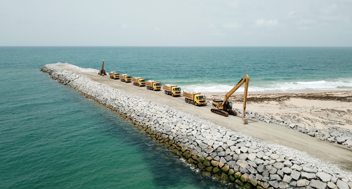 這是2018年3月29日在尼日利亞拉各斯州萊基深水港拍攝的防波堤。萊基深水港一期投資建設(shè)兩個集裝箱泊位。一期工期約3年,由中國港灣承建。新華社發(fā)(蔣新彤攝)