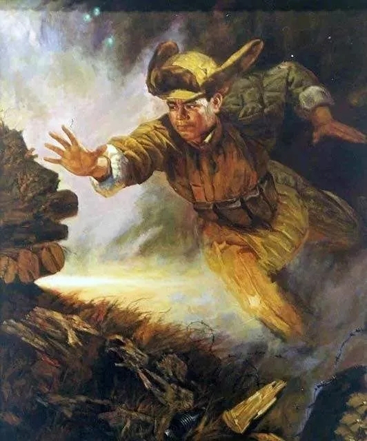 0號陣地上,135團(tuán)六連僅存16人,在對4個(gè)子母堡的爆破中,3個(gè)爆破組都沒能接近地堡,就在途中傷亡殆盡。只剩下營參謀長張廣生、六連長萬福來、六連指導(dǎo)員馮玉慶、營訊員黃繼光、連通訊員吳三羊和肖登良。后來的事大家都知道,他們炸掉了三個(gè)地堡,付出的代價(jià)是吳三羊犧牲,肖登良重傷,黃繼光爬到最后一個(gè)地堡前,全身已經(jīng)七處負(fù)傷。他爬起來,用力支起上身,用胸膛擋住敵人的機(jī)槍眼。犧牲后的黃繼光全身傷口都沒有流血,地堡前也沒有血跡──血都在路途上流盡了。